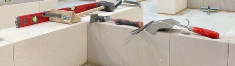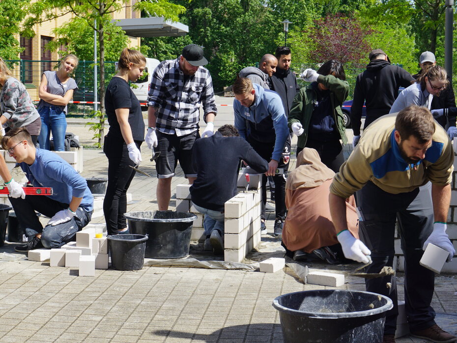 - Ihre Studierenden mauern in vorgegebener Zeit eine einfache Wandkonstruktion aus Kalksandstein und Porenbeton.